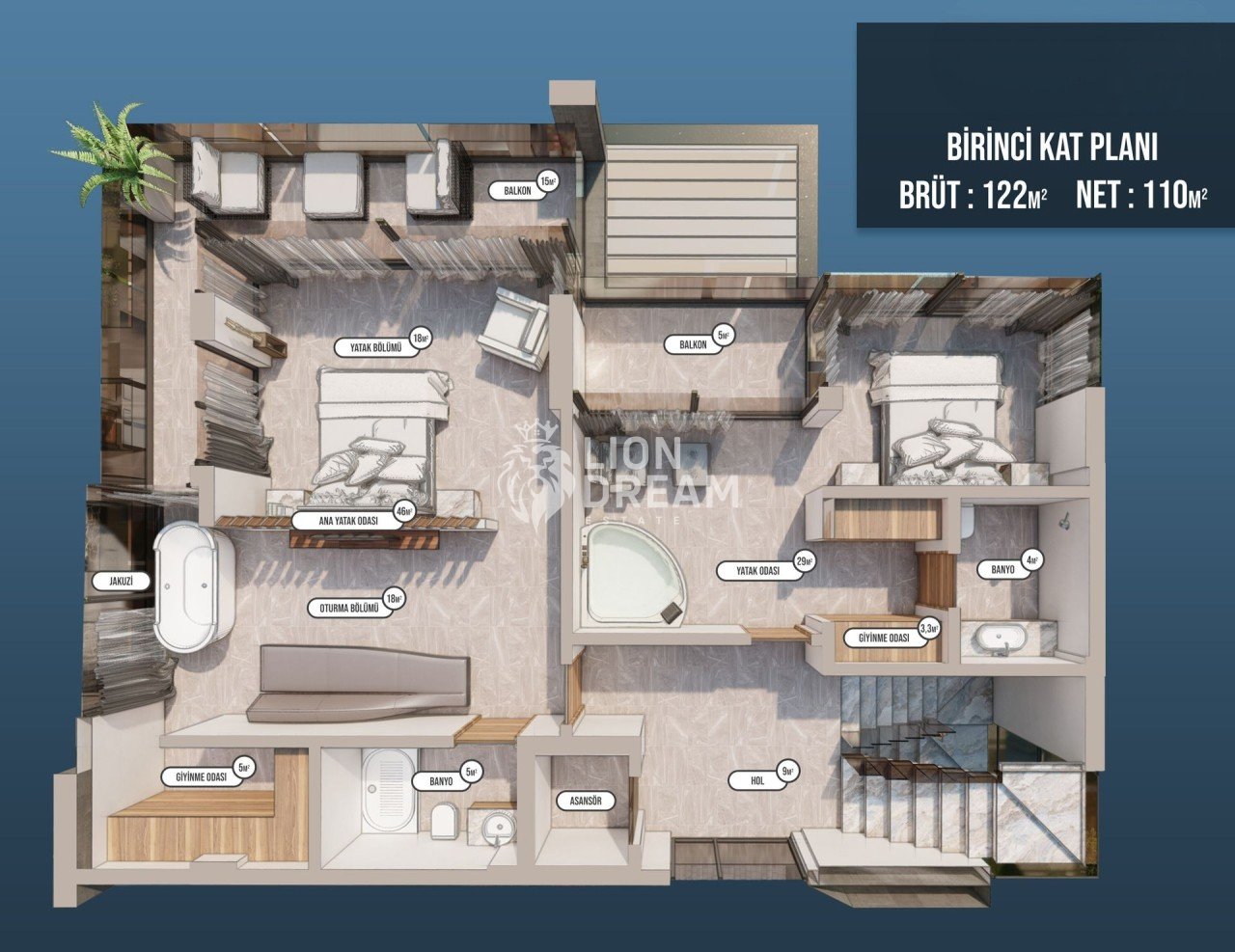 Geniş iki adet yatak odasına sahip olan birinci kat, toplamda 122m² kullanım alanı sunmaktadır. İki yatak odasıda deniz ve manzaraya bakacak şekilde tasarlanmıştır, yine aynı şekilde iki yatak odasında da Balkon, Giyinme Odası, Banyo ve Jakuzi bulunmaktadır. Brüt :122m² / Net:110m²