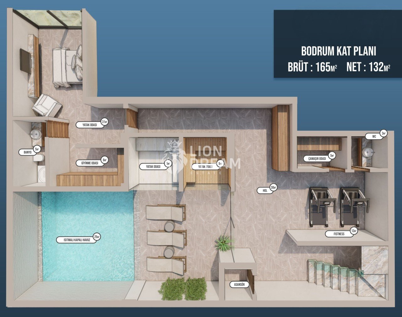 Bir villayı lüks olarak sınıflandırabilecek ayrıntılara yer verilen Bodrum Kat içerisinde; Hamam, Sanua, Isıtmalı Kapalı Havuz ve Fitness yer almaktadır. Bunların yanı sıra, suit yatak odası ve çamaşır odası da bulunmaktadır. Brüt :165m² / Net:132m²