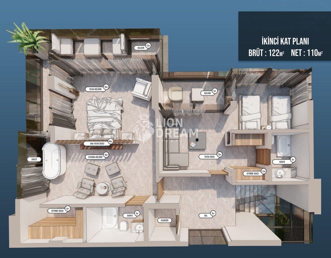 Bir adet suit genç odası ve bir adet suit geniş yatak odasına sahip olan ikinci kat, birinci kat ile aynı metraja ve özelliklere sahiptir. Genç odası ve Yatak odasında oturma alanları sunulmuştur. Brüt :122m² / Net:110m²