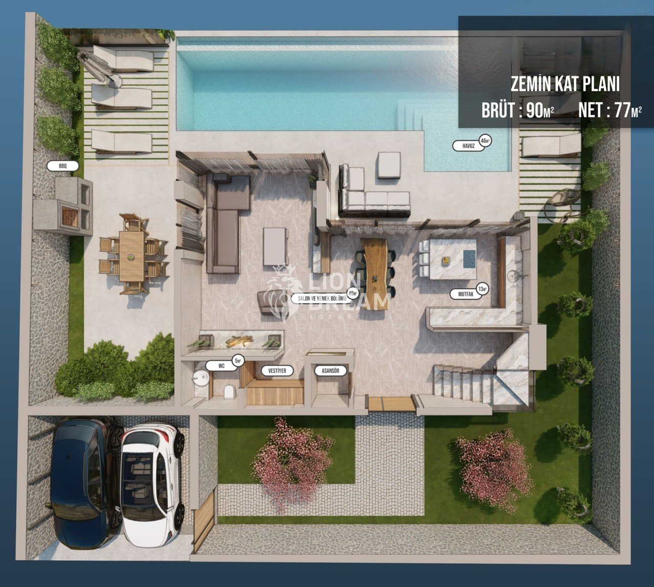 İki araçlık otopark alanı, BBQ alanı ve Altı kişilik bahçe masası, Geniş Havuz Terası, Sonsuzluk Havuzu (Infinity-pool), 49m² Geniş Salon ve Yemek alanı, 13m² Mutfak bulunmaktadır. Brüt :90m² / Net:77m²
